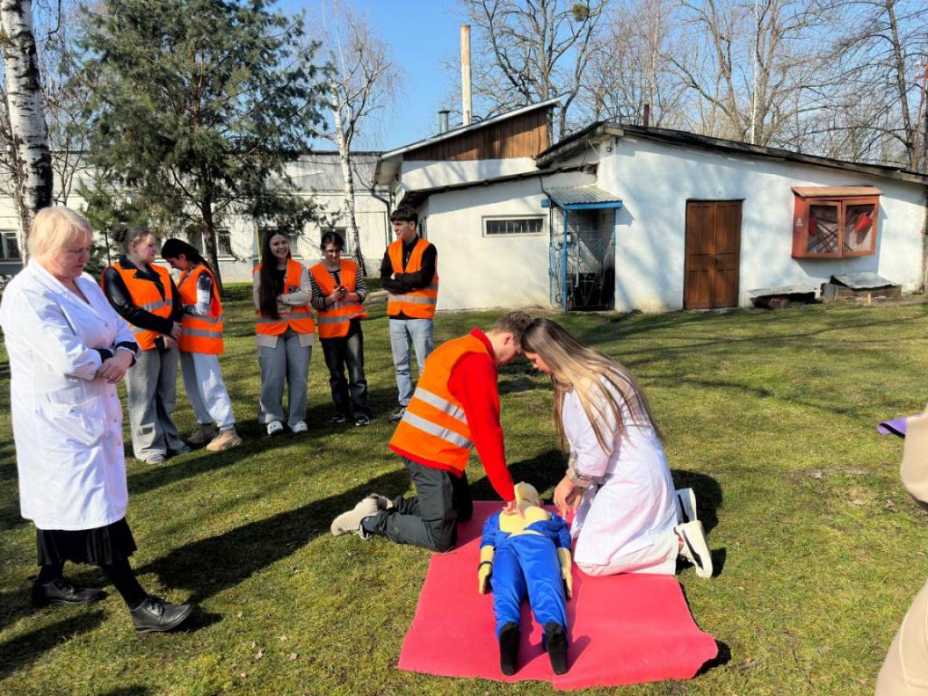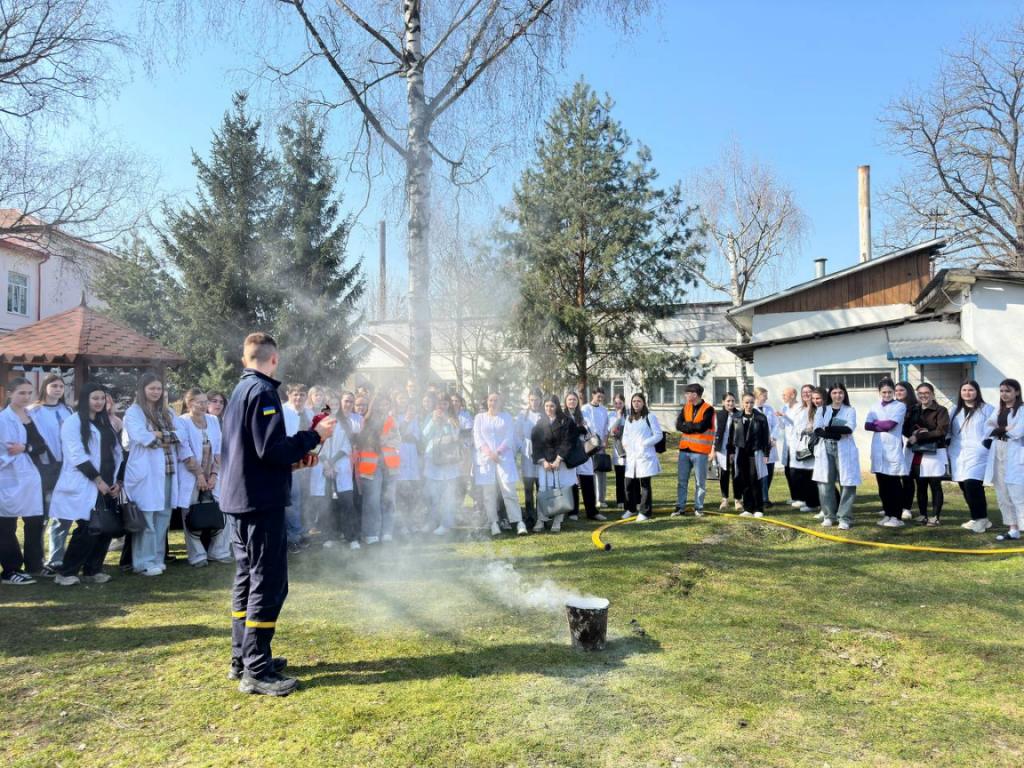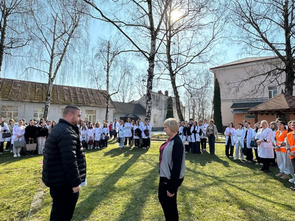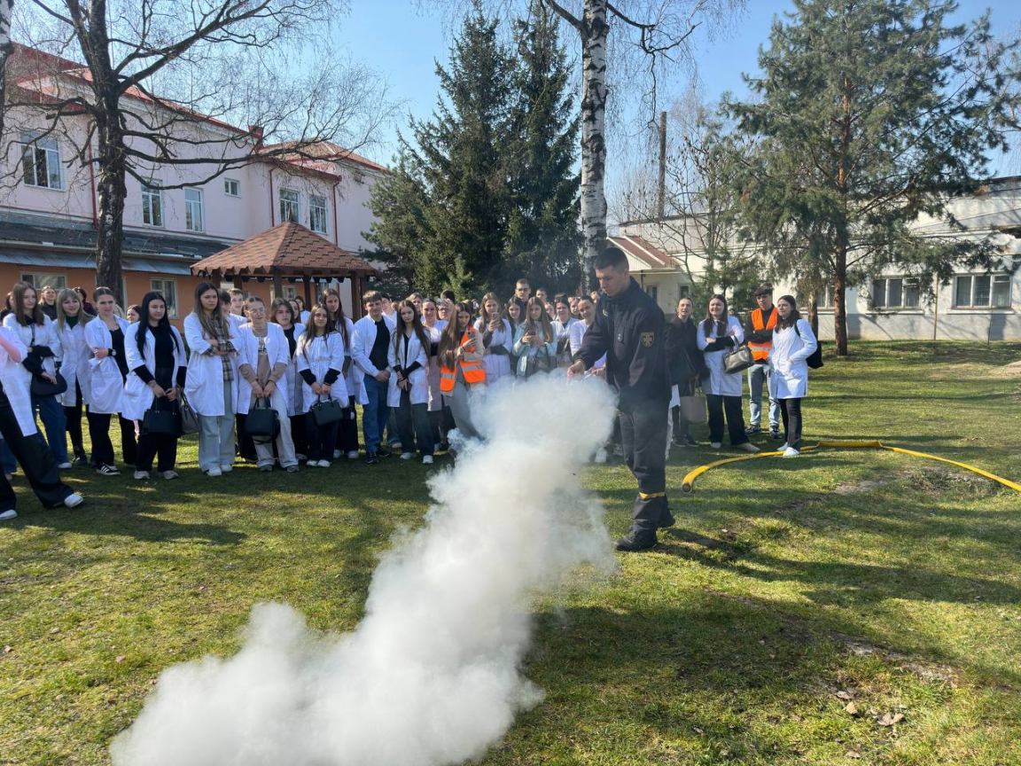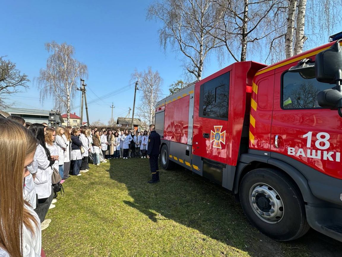 З метою підвищення рівня знань здобувачів освіти та персоналу з питань пожежної та техногенної безпеки, порядку дій при виявленні вибухонебезпечних предметів та правил безпечної поведінки, а також відпрацювання злагодженості дій при здійсненні евакуації та з метою популяризації професії рятувальника та здійснення професійно-орієнтаційної роботи серед студентів та у рамках проведення Дня цивільного захисту 24 березня 2026 року у Вашковецькому медичному фаховому коледжі, керівником цивільного захисту коледжу Дмитром Макарою проведені об’єктові навчання і тренування з питань цивільного захисту із залученням рятувальників 18 ДГТРЧ 1 ДПРЗ та Вижницького РВ ЦЗ та ПД Головного управління ДСНС України у Чернівецькій області та спеціальний аварійно-рятувальний автомобіль. Студенти-гуртківці під керівництвом Наталії Сащук продемонстрували майстер — клас по наданню домедичної допомоги під час надзвичайних ситуацій.