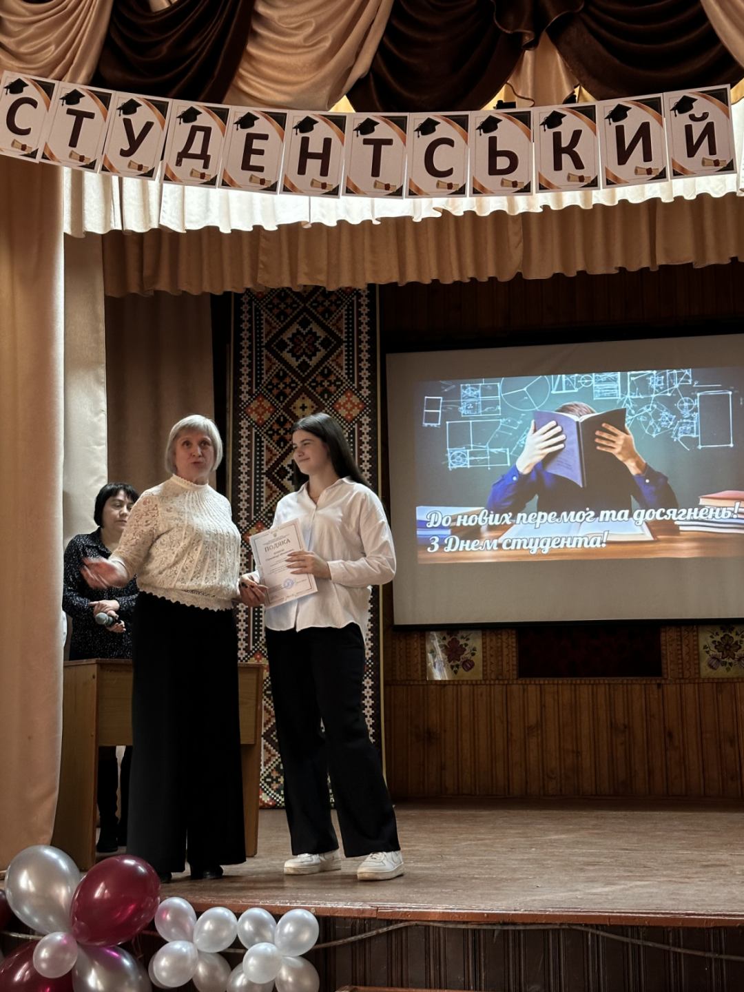 Зі словами привітання виступив начальник відділу освіти, культури, молоді та спорту Вашківецької міської ради Володимир Лучак та нагородив студентів преміями та грамотами. До привітань долучилася в.о. директора коледжу Світлана Макара, яка також нагородила грамотами студентів за високі досягнення в навчанні та активну участь у студентському житті коледжу.