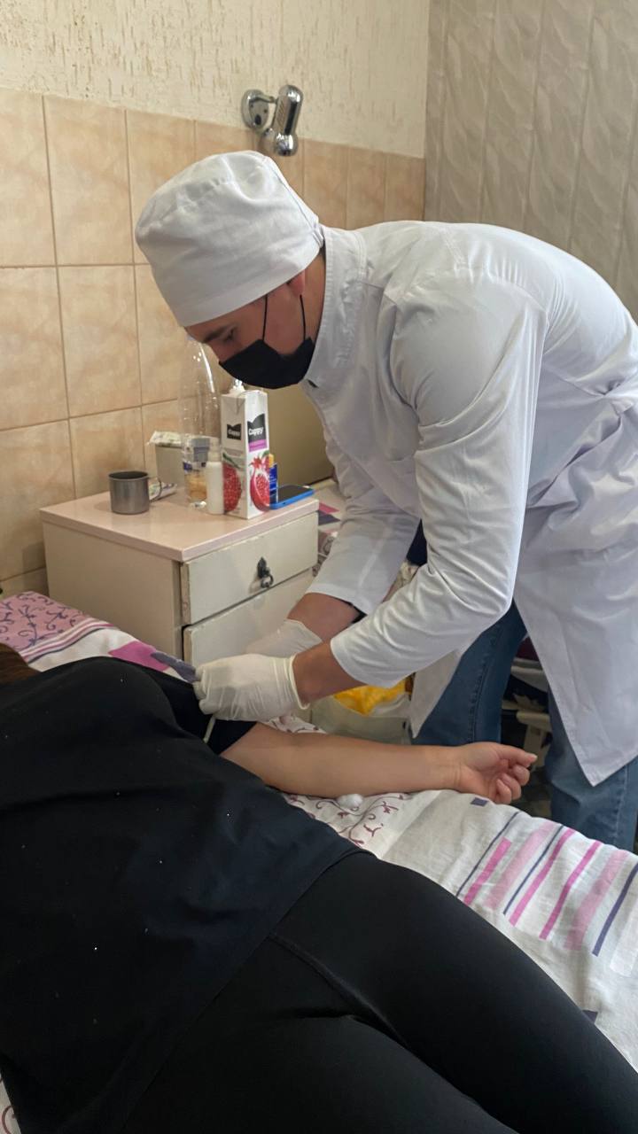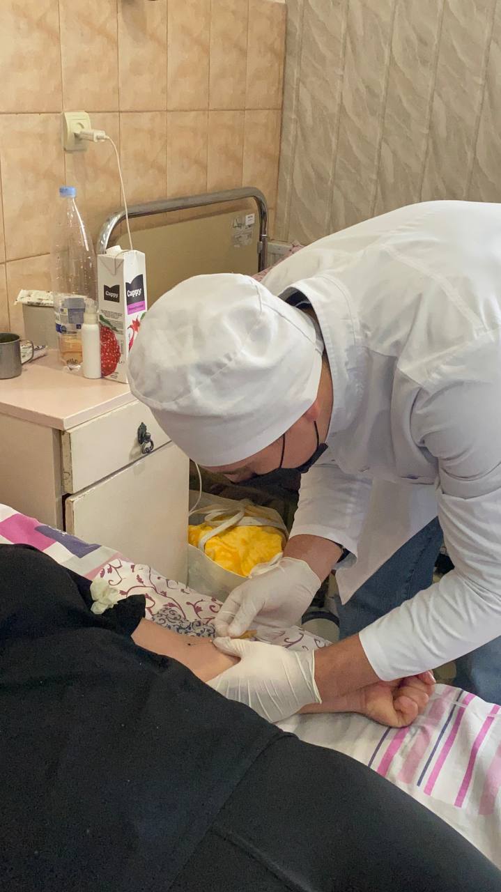 У хірургічному відділенні студенти приймали участь у огляді пацієнтів завідуючим відділенням Пілава Григорієм Івановичем з судинною патологією ніжних кінцівок, здійснювали перев’язки та виконували призначення лікаря.